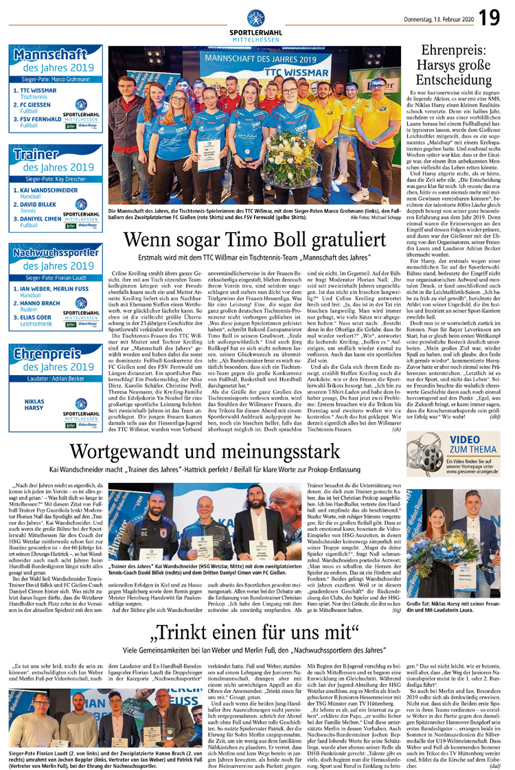 Für uns war die Nominierung schon eine Ehre und uns war allen klar, dass es schwierig bis unmöglich werden würde die Fußballer zu schlagen. Dies hörten wir auch von anderen, die schon an vergangenen Sportlerwahlen beteiligt waren, dass es gegen „große Vereine und Sportarten schwierig ist Stimmen zu erhalten, um solch eine Wahl zu gewinnen. Nichtsdestotrotz nach dem Motto: „David gegen Goliath haben wir die Werbetrommel für unsere Mannschaft kräftig gerührt. Wie schon erwähnt, alleine dass an uns gedacht und die Leistung unserer Damenmannschaft mit einer Nominierung gewürdigt wurde, war schon eine große Auszeichnung, dass wir als Tischtennismannschaft bei den „Großen dabei sein dürfen und die erbrachte Leistung anderen aufgefallen ist ebenfalls.