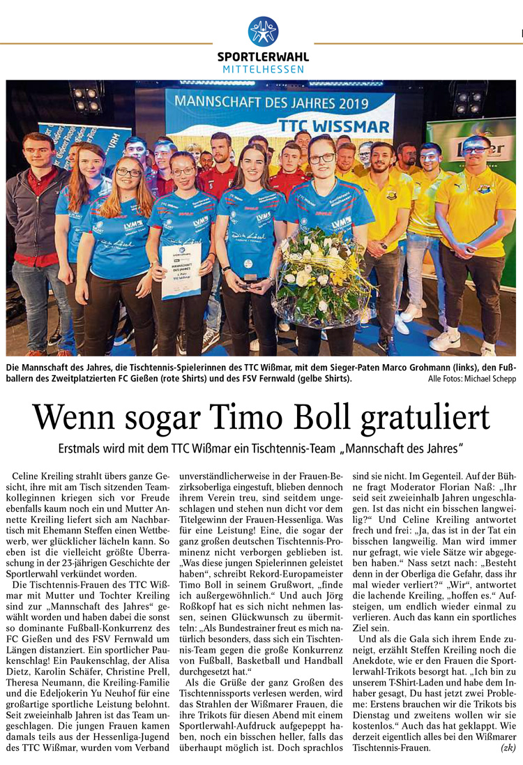 Die Damenmannschaft (Lin, Alisa, Céline, Karoline, Paulina, Christine, Theresa, Annette) des TTC Wißmar ist vom Gießener Anzeiger und der Licher Brauerei für eine von drei Mannschaften des Jahres nominiert worden.