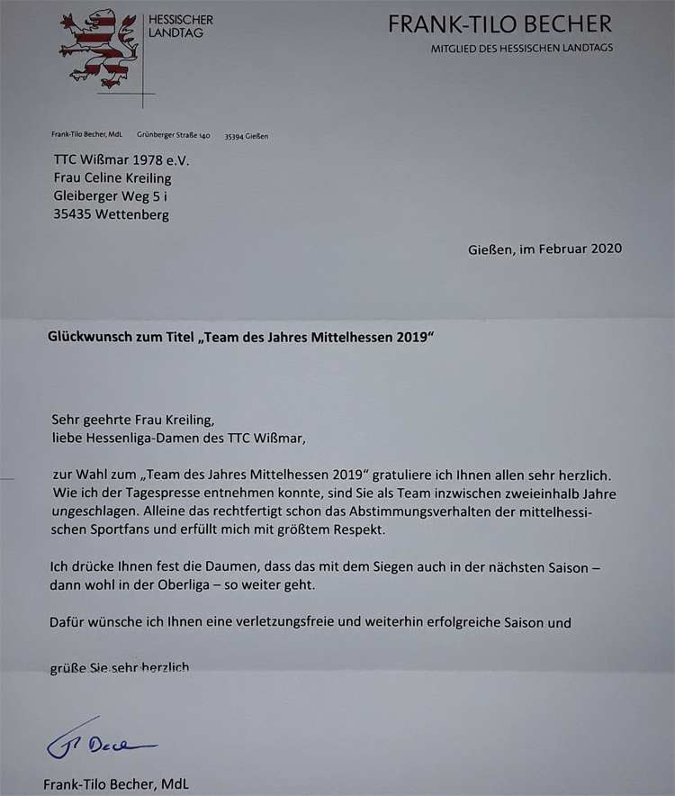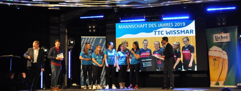 Das Ergebnis der Sportlerwahl Mittelhessen wurde bis zur Verkündung an den Feierlichkeiten in der Admiral-Music-Lounge geheim gehalten. Lediglich ein Anruf, unsere Damen sollten ihre TT-Schläger mitbringen, erreichte uns im Vorfeld der Veranstaltung. Also ohne große Erwartungen und mit den Gedanken, dass es für uns schon eine Ehre ist überhaupt dabei zu sein, begann die Veranstaltung mit der Bekanntgabe der Sieger des Ehrenpreises, des Nachwuchsportlers und des Trainers des Jahres. Und dann wurde der Umschlag für die Mannschaft des Jahres geöffnet und worauf von uns niemand gewettet hätte, darauf stand unsere Damenmannschaft …